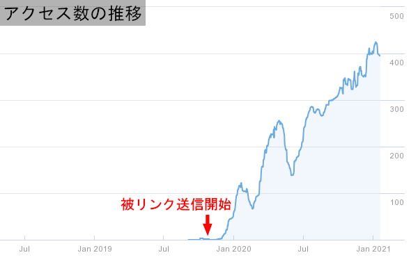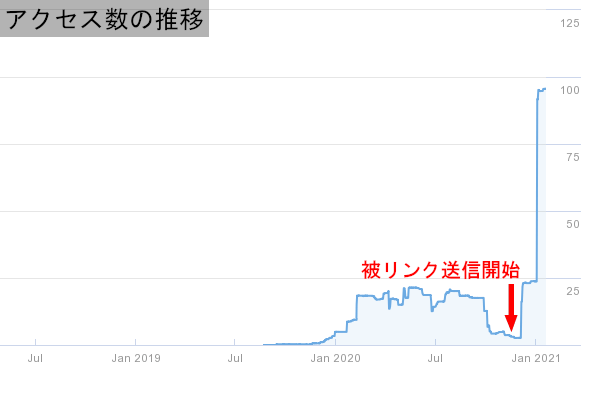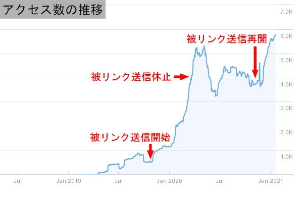 | 補足 | 新規ドメインでブログを作成したものの100記事を超えてもPVの伸びが悪いため、検索結果で上がりきっていない個別記事に1週間に10本ずつ被リンクを送信(1記事あたり2本x5記事)。被リンク送信から3週間ほどでPV数が多少伸び、その後も被リンク送信を同ペースで続け、6週間後に大幅に個別ページの順位が向上。それに伴いPVも急増。その後、順位が向上したため被リンク送信を休止したものの、アルゴ変動により順位が下落したので再度個別ページに被リンク送信を開始。被リンク送信再開後は順調に右肩上がりに回復。 |